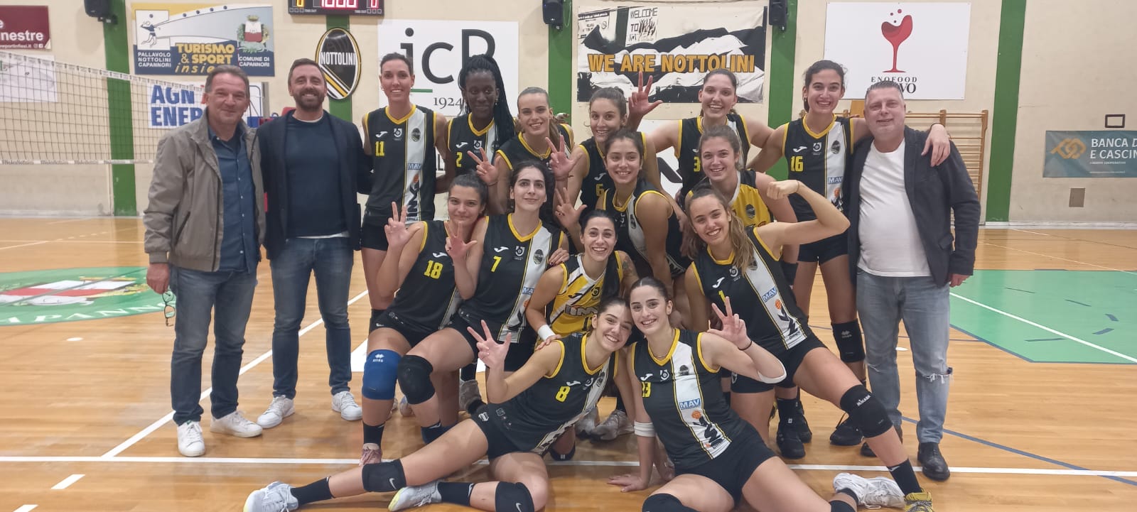 Dopo le sconfitte contro Cesena e Montesport la squadra di Meri Malucchi vince il suo primo derby stagionale superando 3-1 Unomaglia Valdarninsieme e conquista i primi tre punti del campionato nel girone D di B1. La Nottolini soffre più del previsto contro la squadra di coach Marco Lapi ma riesce ad avere la meglio grazie ad una perfetta difesa di Maila Venturi e la buona vena negli attacchi di Alessia Sgherza, Diagne Astou e della talentuosa diciottenne Margherita Meoni. Questo lo schieramento iniziale bianconero: Mammini in regia con opposta Meoni; Astou e Secciani al centro; Sgherza e Fatone di banda e Venturi libero. Nel corso della partita sono entrate Benedetta Catani, Sofia Cusma al posto di Noemi Fatone, Giulia Lunardi al posto di Margherita Meoni ed Ester Grucka per far rifiatare Francesca Mammini. In un primo set equilibrato Mammini e compagne sono riuscite a farla franca 25-21. All'inizio partono senza grandi sussulti, ma poi si impongono al proscenio con Alessia Sgherza che è la prima ad entrare in ritmo ed a mettere a segno punti decisivi. La squadra ospite pareggia i conti nel secondo parziale spuntandola 17-25. Il ritorno in campo vede una IMG Nottolini aggressiva ed una Unomaglia Valdarninsieme che riesce soltanto a tratti a reagire al suo gioco: 25-20. Nel quarto decisivo set dopo una partenza favorevole alle valdarnesi decise a riportarsi in parità, la Nottolini nella fase centrale mette la freccia, sotto la guida di una Maila Venturi impeccabile in ricezione, mentre Alessia Sgherza continua a martellare il non perfetto muro avversario, consentendo alla squadra di casa di chiuderlo a suo favore 25-20 fra l'entusiasmo collettivo di un Palapiaggia gremito di tifosi che hanno costantemente incitato la propria squadra. Un successo che da morale ad una squadra giovane che però ha molto da migliorare anche se un passo avanti è stato fatto rispetto alle prime due uscite stagionali.