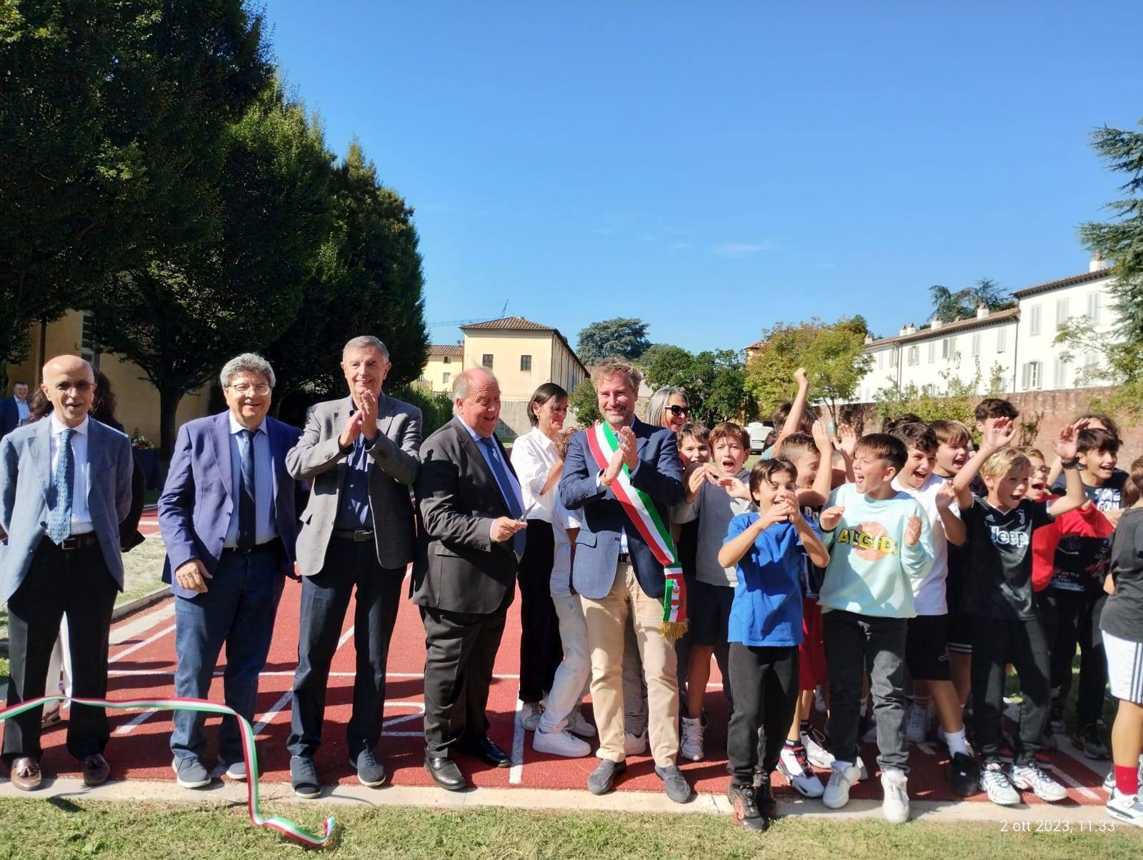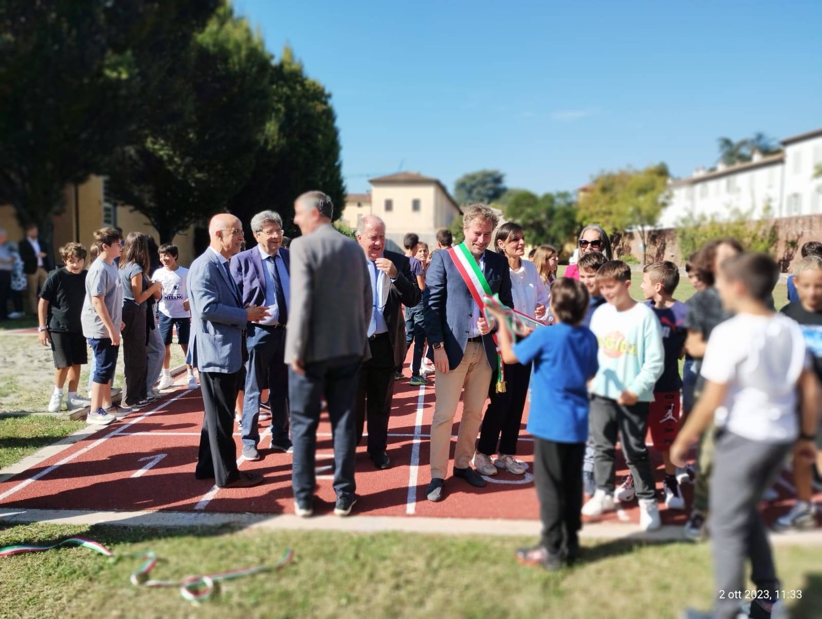 Il sindaco ha eseguito il tradizionale taglio del nastro sulla pista di atletica insieme al presidente Montinari, alle altre autorità presenti e agli alunni che lo hanno circondato festosi e coi quali si è intrattenuto per un po'.
