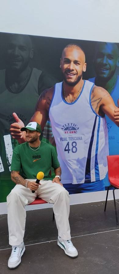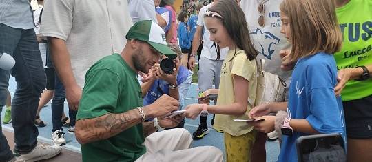 Significativo il saluto da parte del giovane atleta Gioele che, essendo stato protagonista di un gesto di fair play durante una competizione proprio al campo scuola “Moreno Martini”, si è meritato in dono la maglia commemorativa n° 94 (anno di nascita di Jacobs) autografata e con impresso il proprio logo assieme a quello della società lucchese. Poi alla fine, e finalmente, il momento più atteso per tutti i presenti, quello degli autografi e delle fotografie. Jacobs, con grande disponibilità ed una sincera cortesia, non sempre scontata da parte dei personaggi famosi, si è fatto sommergere dalla folla ed ha lasciato a tutti il ricordo di un giorno e di un incontro veramente speciale.