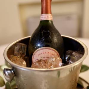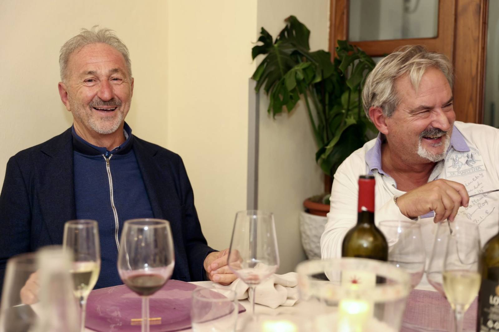 A tavola l'hanno fatta da padroni uno champagne Joseph Perrier per un brindisi, quindi il vino di punta della Villa Santo Stefano, azienda vinicola di Pieve Santo Stefano di proprietà di due coniugi tedeschi, il Loto, un rosso corposo e intenso di 14,5° così denominato proprio per la presenza, nella tenuta e nell'azienda, del fior di loto di orientale provenienza. Accanto a questa bottiglia, un altro rosso, con gradazione lievemente inferiore, 14°, proveniente dai vitigni coltivati in località Castellina Marittima, il Castello del Terriccio, tra l'altro lo stesso nome dell'azienda vinicolaavviata da Gian Annibale Rossi di Medelana.