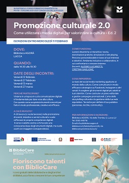 «Promozione culturale 2.0: come utilizzare i media digitali per valorizzare la cultura» è il tema del corso gratuito, nato nell'ambito di Bibliocare che si svolgerà dal 13 febbraio a Lucca, alla Biblioteca Agorà, in centro storico.