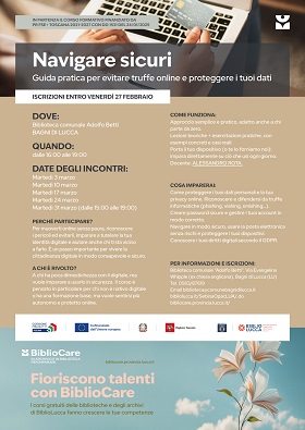 Rush finale per le iscrizioni al corso gratuito «Navigare sicuri - Guida pratica per evitare truffe online e proteggere i tuoi dati», organizzato nell'ambito del progetto Bibliocare alla Biblioteca comunale 'Adolfo Betti' di Bagni di Lucca: la scadenza delle iscrizioni, infatti, è fissata per il 27 febbraio.