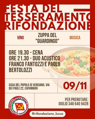 Domenica 9 dalle 19.30 si svolgerà la festa del Tesseramento di Rifondazione Comunista presso la Casa del Popolo di Verciano (via dei Paoli 22, Capannori).
