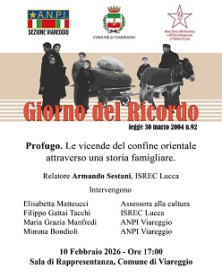 Nel pomeriggio, alle ore 17.00, nella Sala di Rappresentanza del Comune di Viareggio, si terrà l’incontro pubblico “Profugo. Le vicende del confine orientale attraverso una storia famigliare”, che vedrà come relatore Armando Sestani (Isrec).