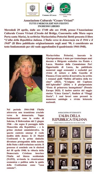 Mercoledì 29 aprile, dalle ore 17:00 alle ore 19:00, presso l’Associazione Culturale Cesare Viviani (Circolo del Bridge, Casermetta sulle Mura sopra Porta Santa Maria), la scrittrice Mariacristina Pettorini Bettti presenta il libro “L’alba della Repubblica italiana. L’Italia verso la democrazia tra il 1944 e il 1948” (Il libro è considerato un testo fondamentale per chi vuole approfondire il quadriennio 1944-1948).