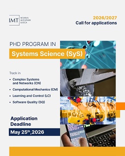 Tredici posizioni per il dottorato in Systems Science: aperto il nuovo bando della Scuola IMT con scadenza il 25 maggio 2026. Con un'offerta che si rivolge a laureati in ingegneria, informatica, fisica, matematica, statistica e discipline affini, il programma si articola in quattro indirizzi: "Complex Systems & Networks", "Computational Mechanics", "Learning and Control" e "Software Quality".