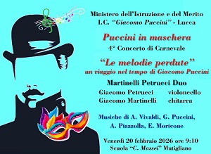 Nell’ambito del progetto musica dell’Istituto Comprensivo G. Puccini a cura del docente referente Prof. Antonio Della Santa e dell’insegnate di Musica Prof.ssa Lucia Coli, condiviso con la Dirigente Scolastica ed i Consigli di Classe del plesso, si terrà il giorno 20 febbraio alle ore 9.10 presso la scuola “C. Massei” di Mutigliano il 4° Concerto di Carnevale - Puccini in Maschera, a cura del violoncellista Giacomo Petrucci e del chitarrista Giacomo Martinelli.