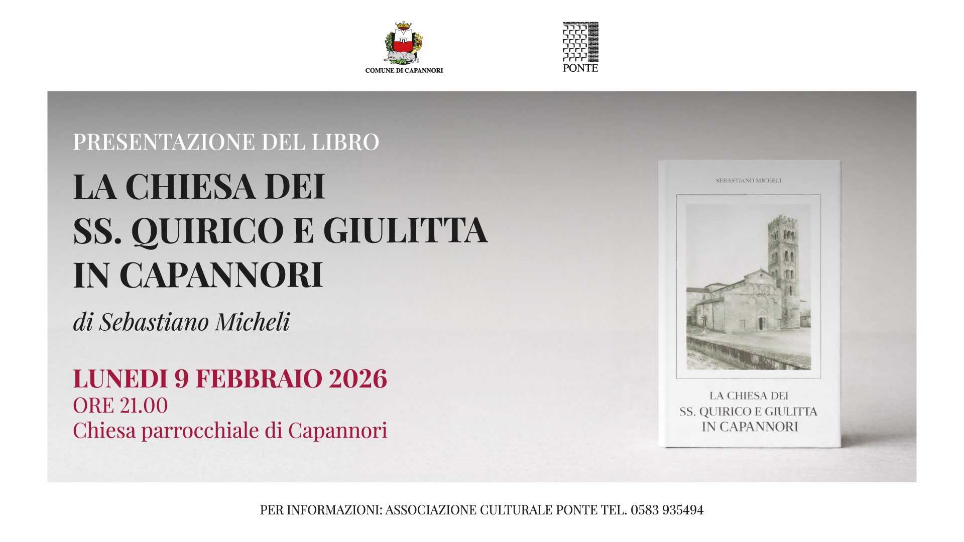 Lunedì 9 febbraio, alle ore 21, alla chiesa parrocchiale di Capannori è in programma la presentazione del libro 'La chiesa dei SS. Quirico e Giulitta in Capannori' di Sebastiano Micheli edito dall'associazione culturale Ponte.
