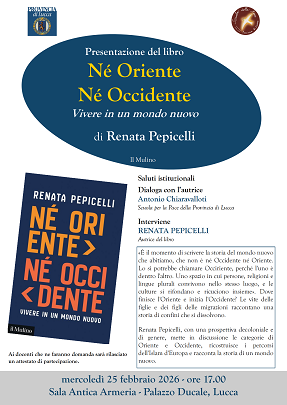 Come approcciarsi al nuovo mondo che sta prendendo forma giorno dopo giorno di fronte ai nostri occhi? Una domanda alla quale, mercoledì 25 febbraio, a partire dalle 17, nell'Antica Armeria di Palazzo Ducale, quando Renata Pepicelli presenterà il suo libro 'Né Oriente, né Occidente - Vivere un mondo nuovo' (Ed. Il Mulino), dialogandone con Antonio Chiaravalloti della Scuola per la Pace della Provincia di Lucca.