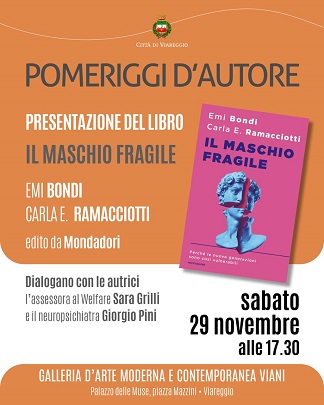 Prossimo appuntamento sabato 29 novembre, alle 17.30 alla Galleria d'Arte Moderna e Contemporanea Viani, con la presentazione del libro "Il maschio fragile" di Emi Boni e Carla E. Ramacciotti, edito da Mondadori.