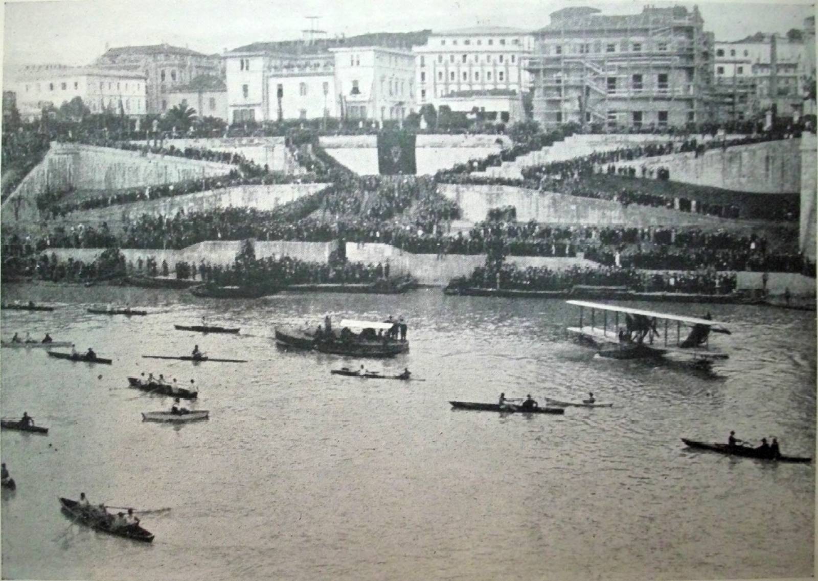 Il 7 novembre 1925 intorno alle ore 15, l’idrovolante con Francesco De Pinedo ed Ernesto Campanelli, che ha sorvolato tre continenti per complessivi 55.000 chilometri ammara nel Fiume Tevere nei pressi di Ponte Ripetta. La folla è immensa e da allora quel luogo sarà chiamato “Scalo De Pinedo”, si compie così una delle più grandi imprese dell’Aeronautica Italiana, un record mondiale, un passo verso il progresso e l’unione tra i popoli.