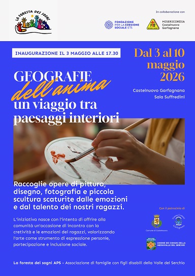 "Geografie dell'anima, un viaggio tra paesaggi interiori" è la mostra di arti visive organizzata da La Foresta dei Sogni APS in collaborazione con la Fondazione Coesione Sociale e la Misericordia di Castelnuovo. Ha il patrocinio del Comune di Castelnuovo Garfagnana, l'Unione dei Comuni della Garfagnana e dell'Unione dei Comuni della Valle del Serchio e verrà inaugurata domenica 3 maggio alle 17.30 a Castelnuovo Garfagnana nella Saletta Suffredini.