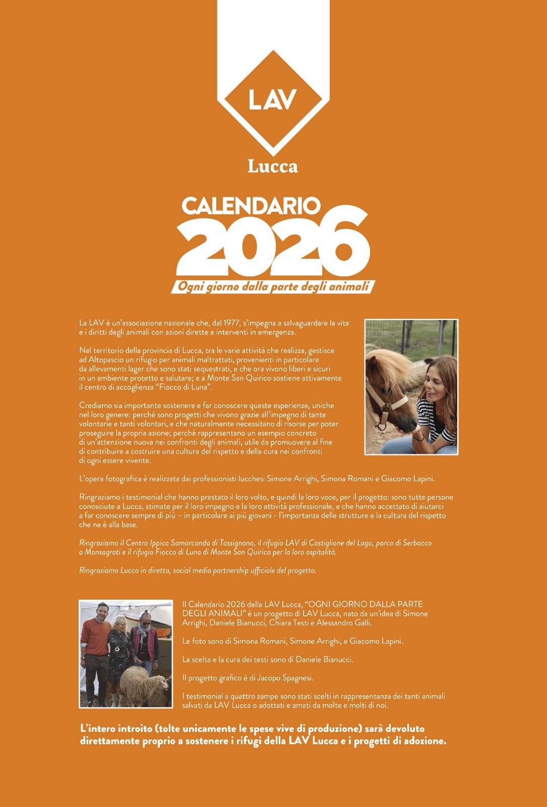 Nasce così l'edizione 2026 del calendario della LAV Lucca "Ogni giorno dalla parte degli animali", un prodotto fotografico che sarà in vendita per raccogliere fondi proprio per l'associazione che si batte e s'impegna sul territorio per sostenere i rifugi e i progetti di adozione.