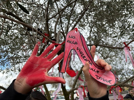 Sempre in mattinata un corteo silenzioso di ragazzi e ragazze, vestiti di nero, ha attraversato via Mazzini con un segno di rossetto sulla guancia, simbolo di solidarietà ma anche di forza e le mani tinte di rosso. In testa al gruppo, una grande sagoma in cartone raffigurante un décolleté dello stesso colore, simbolo universale della lotta contro la violenza di genere. Gli studenti delle classi 3° A e 2° C della scuola media Barsanti, guidati dalle professoresse Ilaria Cipriani e Silvia Baldi e sostenuti dalla dirigente scolastica Maria Teresa Di Leone, hanno allestito davanti alla collegiata di San Martino un'installazione temporanea di scarpe rosse, trasformando la piazza in uno spazio di riflessione: due ragazze hanno recitato la poesia di Shakespeare "In piedi signori davanti a una donna", alternando versi in lingua italiana e inglese, mentre i compagni hanno animato il sagrato con una coreografia che, attraverso gesti e movimenti, ha tradotto le parole in azione. La piccola manifestazione si è conclusa con l'esposizione di alcuni disegni raffiguranti scarpe rosse sull'"Albero dei pensieri", presso lo skate park di via Marconi, a suggellare un percorso simbolico che ha unito giovani, adulti e anziani, uomini e donne, rimarcando come la piaga della violenza non sia "un problema delle donne" ma una responsabilità dell'intera società.