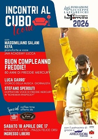 La Fondazione Giuseppe Lazzareschi ricorda Freddie Mercury sabato 18 aprile con un evento unico insieme a tanti ospiti eccezionali. A cominciare dal doppiatore Stefani Sperduti, che è stata la voce italiana di Freddie nel film autobiografico di grande successo Bhoemian Rhapsody" e lo storico della musica e giornalista Luca Garrò, autore della biografia Freddie (in vendita). Ovviamente non poteva mancare la musica dei Queen con Massimiliano Salani e Kefa, voce e pianoforte della Jam Academy di Lucca.