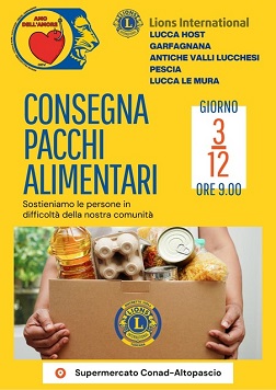 Nell'imminenza delle festività, i Lions Clubs di Lucca Host, Garfagnana, Antiche Valli Lucchesi, Pescia e Lucca Le Mura,del Distretto Lions 108La-Toscana, con il prezioso contributo e la collaborazione della Onlus Amo Dell'Amore ODV, si impegnano anche quest'anno nella consegna di generi alimentari a diverse associazioni presenti sul territorio lucchese.