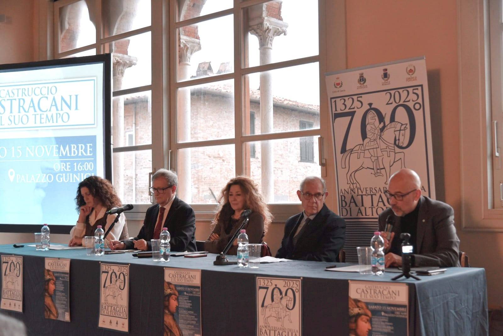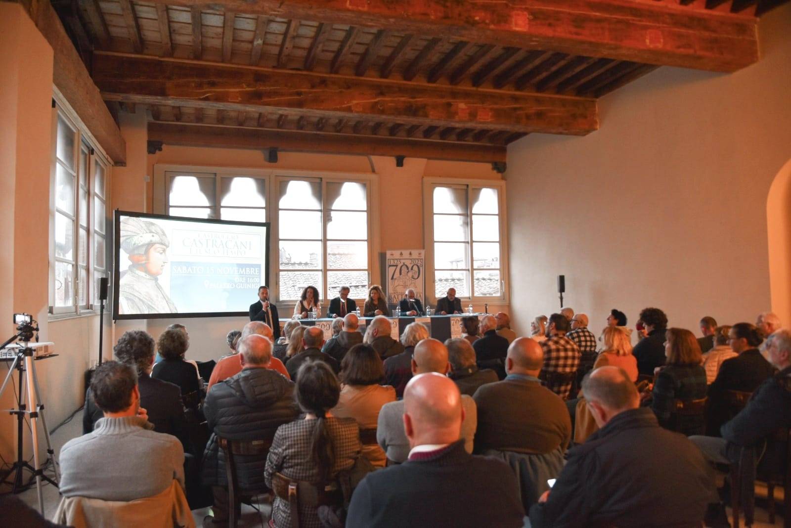 Mario Pardini, dell'assessore alla cultura Mia Pisano e del consigliere con delega alle tradizioni storiche Lorenzo Del Barga, moderato dallo storico e giornalista Alessandro Bedini ha visto alcuni dei medievisti italiani che si sono occupati del Trecento confrontarsi recuperando la figura storica di Castruccio e i molti problemi di interpretazione e lettura che ci ha lasciato. Claudio Carpini dell'Università di Firenze ha ricollegato il personaggio lucchese al complesso tessuto storico italiano del periodo che vede vede il culmine e il declino del sistema comunale italiano dove iniziano a formarsi realtà regionali più vaste. Romina Brugioni dell'Istituto Storico Lucchese ha inquadrato giuridicamente l'eccezionale elezione del condottiero a grande feudatario ereditario dell'Impero con il titolo di duca di Lucca, un riconoscimento inedito e precocissimo nella storia della penisola che si è ripetuto solo raramente e molto più tardi. Isabella Gagliardi ha descritto la società cittadina fra XIII e XIV secolo e i rapporti con la Chiesa che si scontrò violentemente con Castruccio con scomuniche che gravarono per lunghi anni anche sulla città di Lucca. Infine Raffaele Savigni con la Vita Castruccii di Nicolao Tegrimi ha dato una lettura storiografica del rapporto dei Lucchesi con il Castracani e con la sua fama 'ingombrante' per una città di lunga tradizione repubblicana; attraverso la biografia scritta da uno degli umanisti più colti e pubblicata nuovamente nel '700 si comprende come i cittadini seppero superare le contraddizioni e le divisioni di parte trecentesche per appropriarsi degli aspetti più positivi e innovativi di questo personaggio che viaggiò fra le comunità lucchesi in Europa e in Inghilterra apprese l'arte della guerra più moderna nelle Fiandre e concepì un entità regionale alternativa a Firenze in Italia.