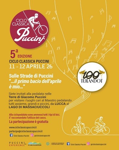 Domenica 12 aprile si svolgerà la quinta edizione della Ciclo Classica Puccini, l'evento non agonistico che unisce nella mobilità dolce, in bicicletta, i territori dove Giacomo Puccini visse e compose le sue opere immortali, attraverso la natura ed i paesaggi uniti dalla ciclopedonale Giacomo Puccini, fra Lucca e Massaciuccoli, lungo le sponde del Serchio e del lago caro al Maestro.