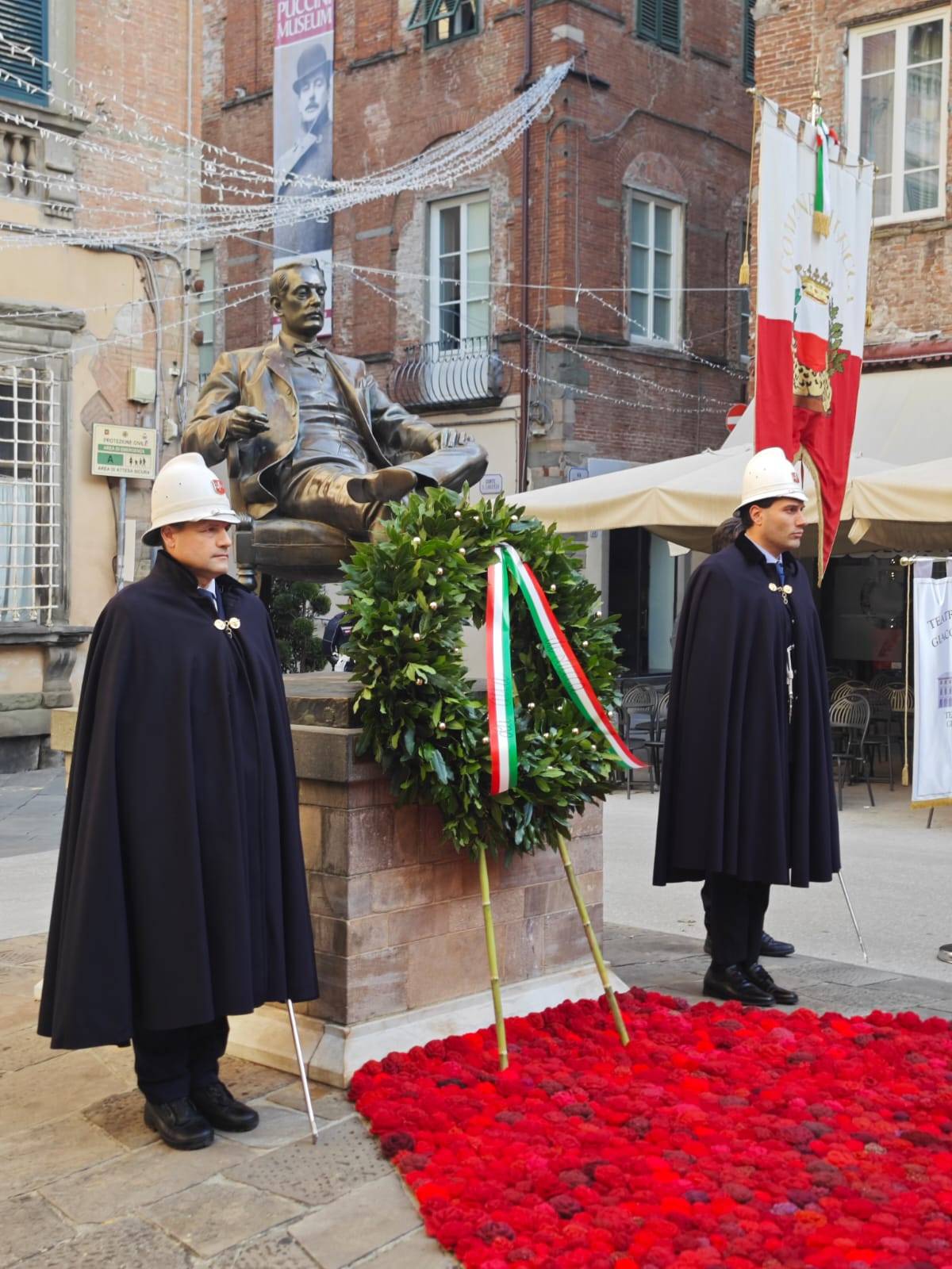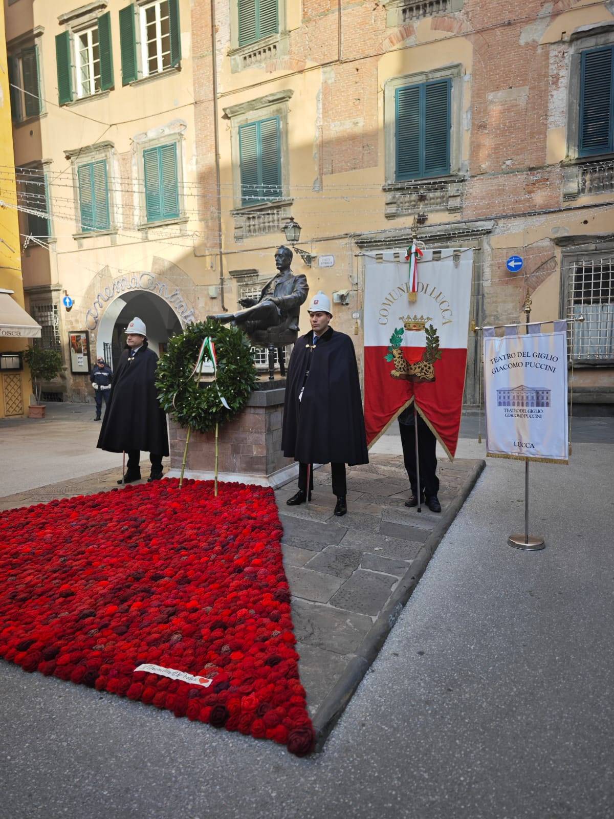 Ricorre oggi il 101esimo anniversario dalla morte di Giacomo Puccini: alle ore 9.30 il sindaco Mario Pardini, presidente della Fondazione Giacomo Puccini, accompagnato da Ilaria Del Bianco - presidente dell'Associazione Lucchesi del Mondo - Giorgio Angelo Lazzarini - amministratore unico del Teatro Del Giglio 'Giacomo Puccini' - Simone Soldati – direttore artistico dell'Associazione Musicale Lucchese – ha deposto una corona d'alloro al monumento di piazza cittadella a Lucca, a pochi passi dal Puccini Museum – Casa natale di corte San Lorenzo. La cerimonia è stata accompagnata dal suono de 'il silenzio' eseguito dalla tromba del Corpo musicale 'Giacomo Puccini' di Nozzano Castello. Per l'occasione davanti al monumento del Maestro è stato steso il tappeto rosso costituito da 1858 rose realizzate a mano dal gruppo delle Uncinettine di Porcari nel 2024.