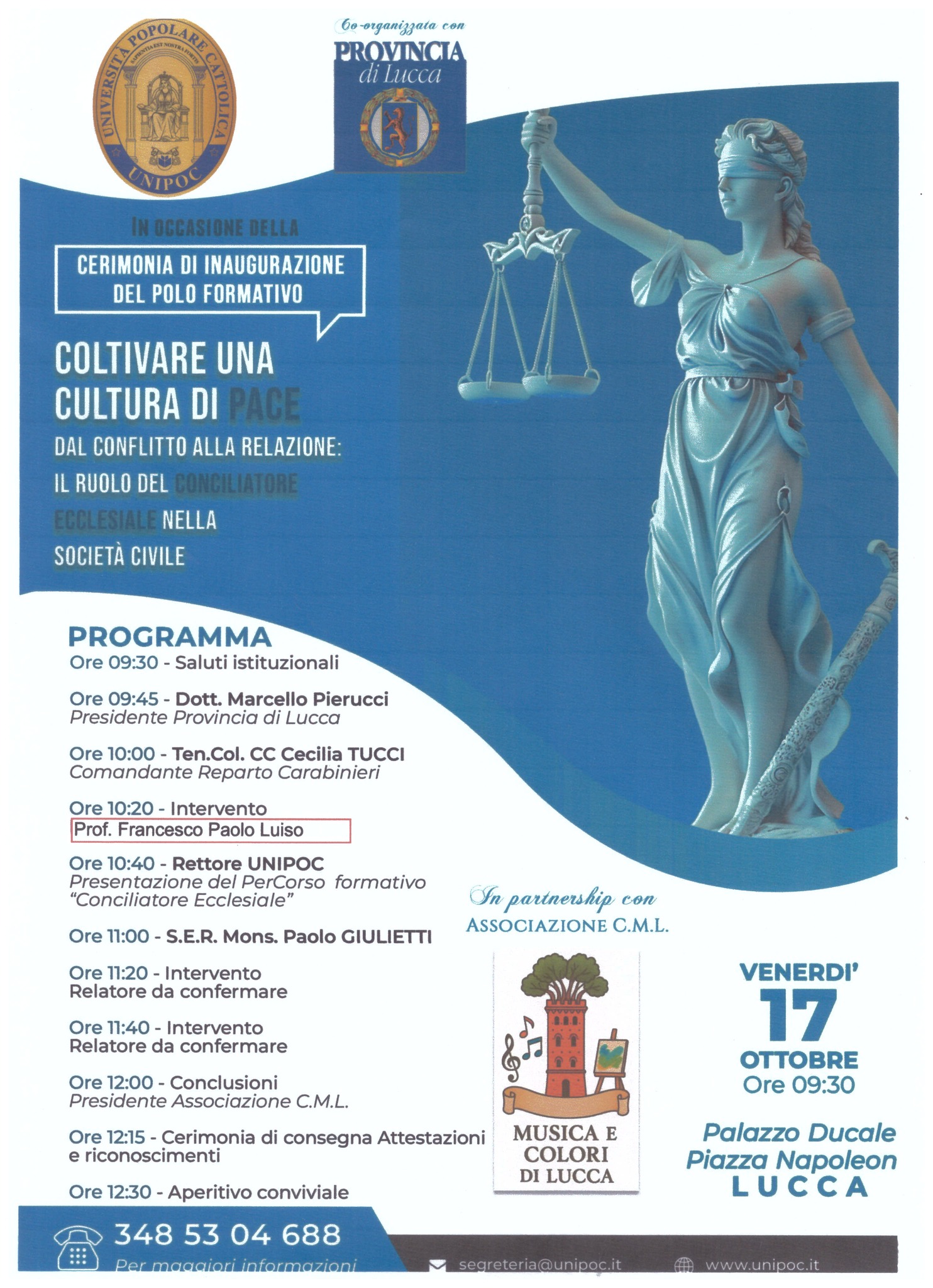 Venerdì 17 ottobre, nella sala di rappresentanza della Provincia, con il patrocinio della Provincia stessa e in collaborazione con l'Associazione C.M.L (Associazione ,musica e colori di Lucca) si terrà il convegno "Coltivare una cultura di pace – Dal conflitto alla relazione".