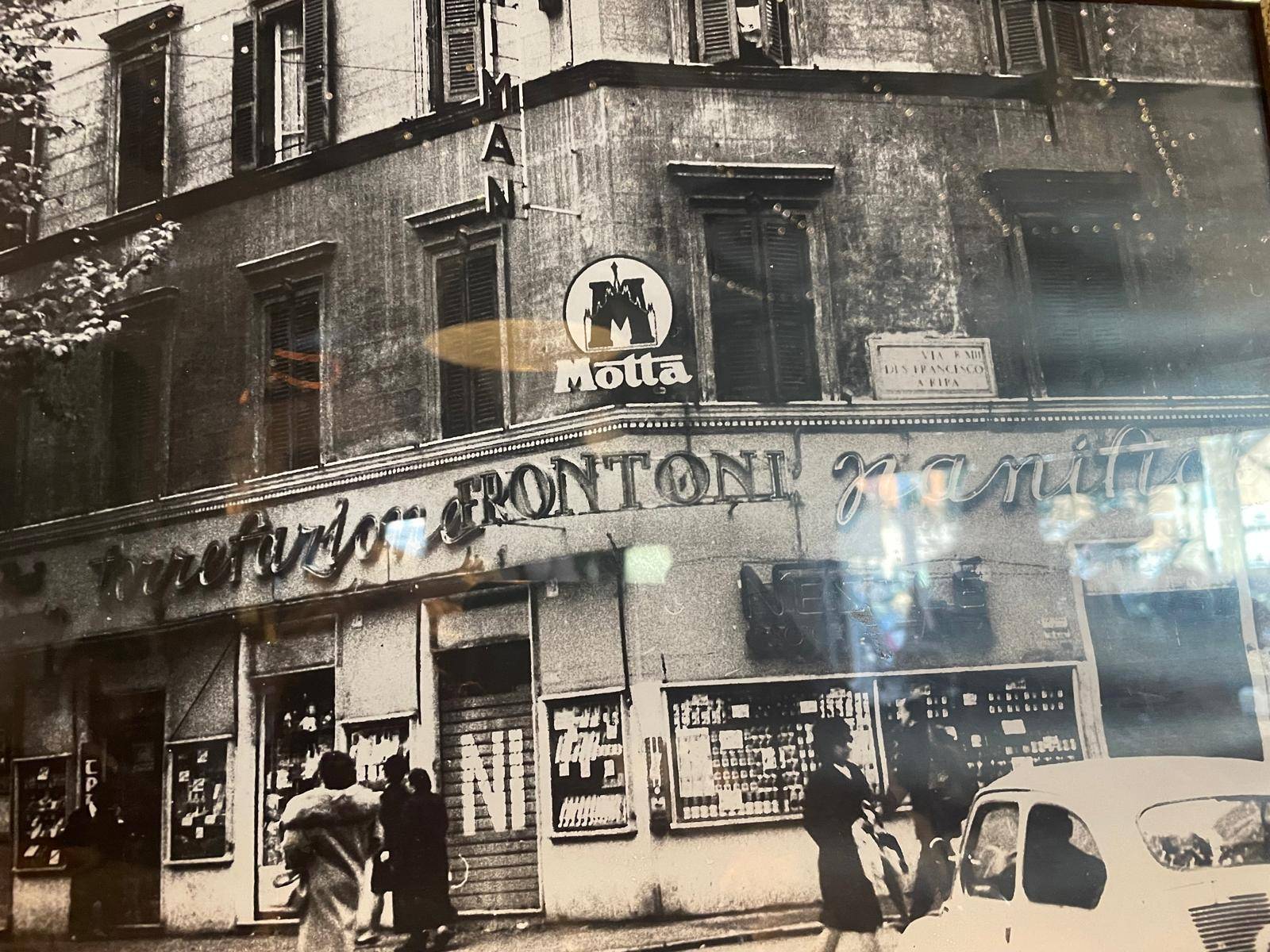 La piazza bianca farcita c'è sempre su richiesta, ma non c'è più la coda di un tempo. In compenso il ristorante è pieno e si mangia molto, ma molto romano e molto, ma molto bene. Un pezzo di pizza bianca farcita con salsiccia spalmata e cicoria è favolosa. Così come la polenta che vogliamo con il sugo di semplice pomodoro. La panzanella sottile sottile e con sopra una farcitura di mozzarella e pomodori a cubetti è buonissima e anche la tagliata con patate arrosto nonostante la carne sia notoriamente migliore dalle nostre parti, è tenera come il burro e godibile al massimo. Carciofi alla giudea e alla romana meritano non un assaggio, ma un doppio assaggio tanto sono ottimi. Strepitosi anche i primi piatti, dalla carbonara a alla cacio e pepe. Il locale è di quelli tipici della cucina romana, senza sfarzo, semplici, ma piacevoli senza troppe seghe come si direbbe noi. Essenziali, pratici, puliti. Dietro di noi, appesi alla parete, due quadretti con altrettante immagini della vecchia sede di Frontoni. La riconosciamo subito, ci prende un groppo alla gola e il tempo sembra riavvolgere il nastro della nostra giovinezza.