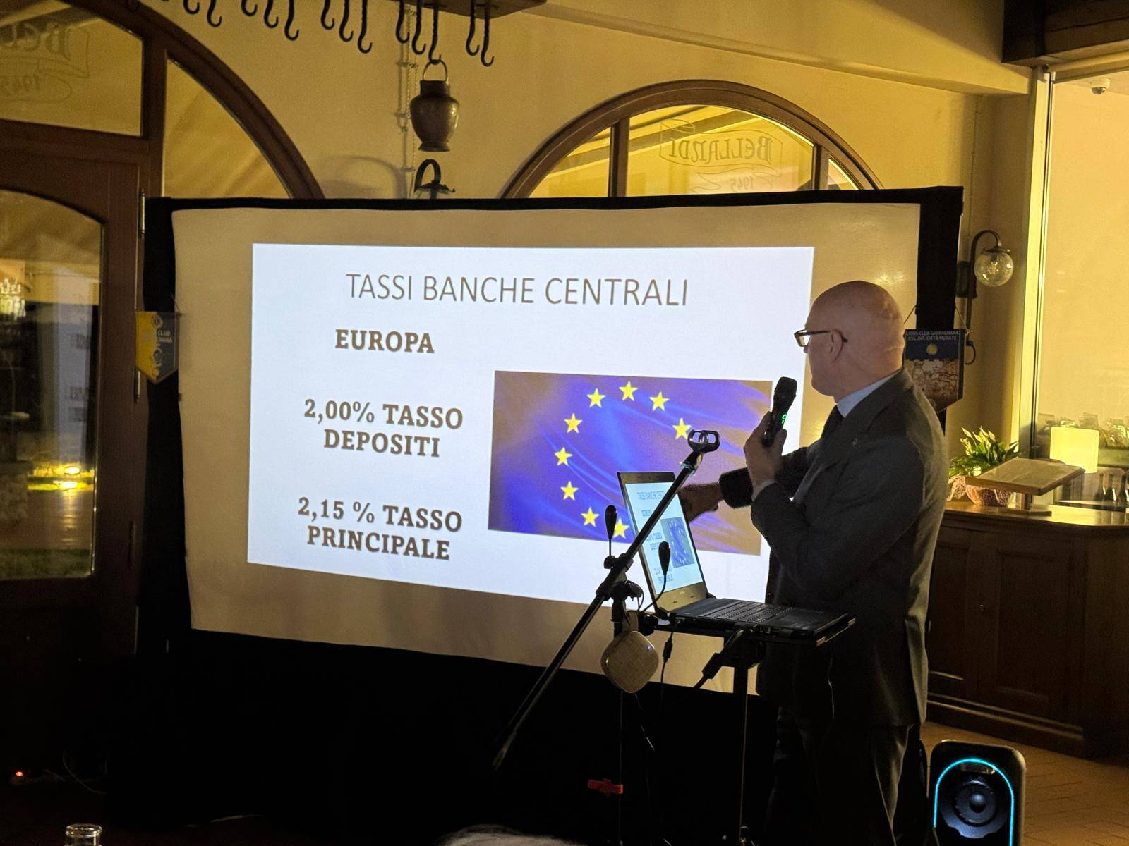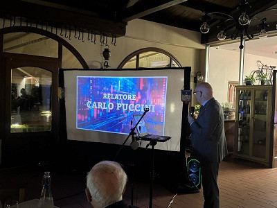 Protagonista della serata è stato il socio del Club Carlo Puccini, consulente finanziario e patrimoniale con qualifica di Private Banker che ha generosamente messo a disposizione e offerto ai presenti un intervento, e non solo, dedicato all’analisi dello scenario economico finanziario contemporaneo. Una vera e propria “lectio magistralis” condotta con professionalità e tecnicismo uniti a una conclamata capacità espositiva e comunicativa. Capacità indiscussa di Carlo che e riuscito a rendere facilmente comprensibili anche ai non addetti ai lavori argomenti complessi e dinamiche di mercato spesso impercettibili e non sufficientemente evidenziate dagli organi comunicativi del main stream.