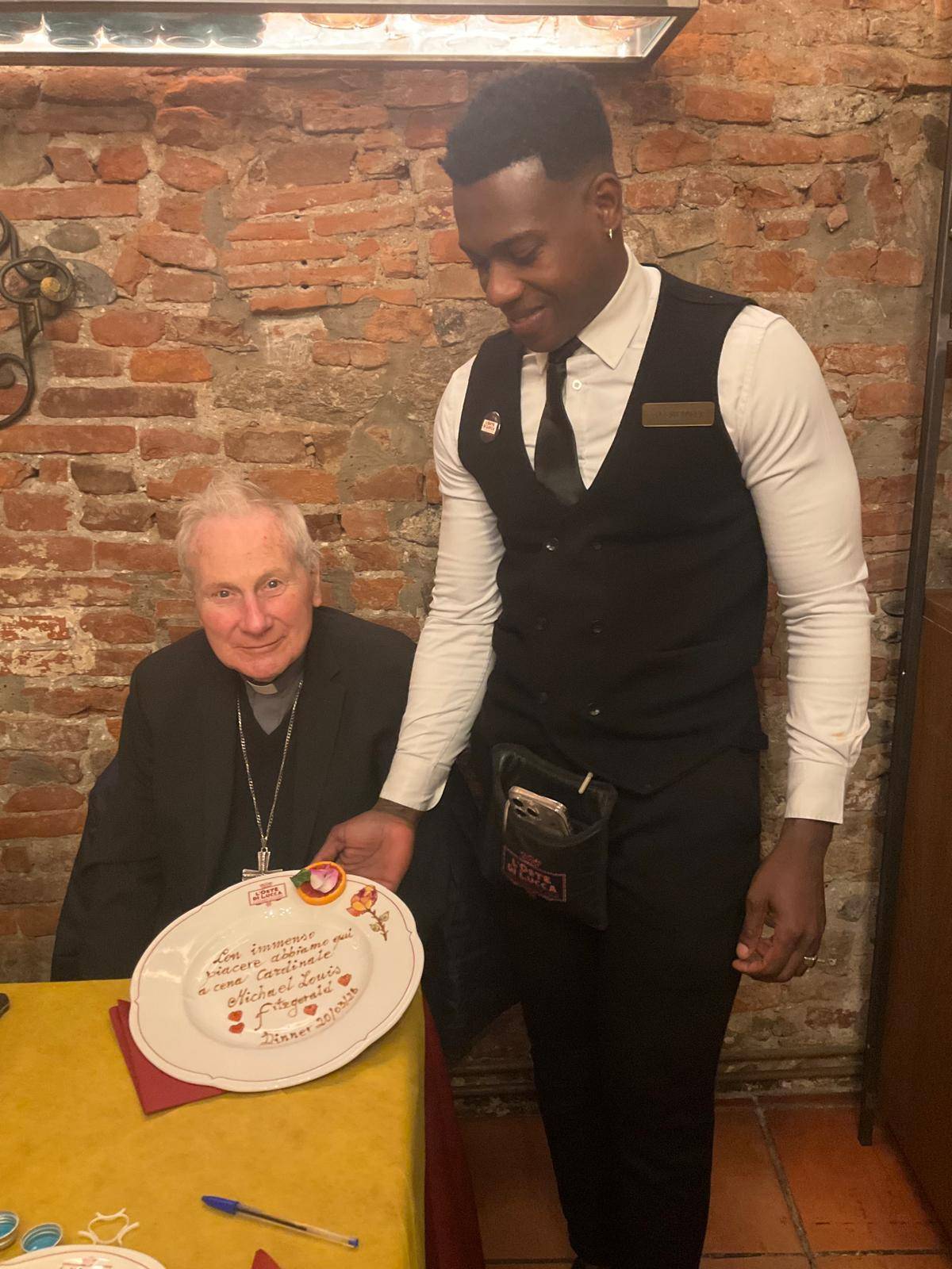 Che sorpresa alcune sere fa al ristorante Oste di Lucca di via Fillungo della famiglia Del Magro. Tra i commensali, infatti, c'era nientepopodimeno che Michael Louis Fitzgerald, cardinale e arcivescovo cattolico britannico, dal 23 ottobre 2012 nunzio apostolico emerito in Egitto. Oltre che ai consueti saluti per un personaggio così rilevante, Vincenzo Botta, responsabile di sala, ha voluto dedicare all'ospite uno dei suoi piatti disegnati al momento con una frase che renda l'idea dell'importanza per il locale di avere un personaggio così illustre. Il cardinale ha presentato a Lucca nell'ambito della settimana di dialogo tra cattolici e musulmani, il libro Salvare insieme il creato - Cristiani e Musulmani un dialogo in cammino scritto dallo stesso cardinale Fitzgerald e da Renata Bedendo.