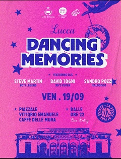 Come già annunciato dall'amministrazione, torna anche quest'anno l'appuntamento con "Dancing Memories", la festa di fine estate promossa dal Comune di Lucca che dopodomani, venerdì 19 settembre, a partire dalle ore 22, animerà piazzale Vittorio Emanuele, davanti al suggestivo scenario del Caffè delle Mura, dopo il grande successo delle due precedenti edizioni.