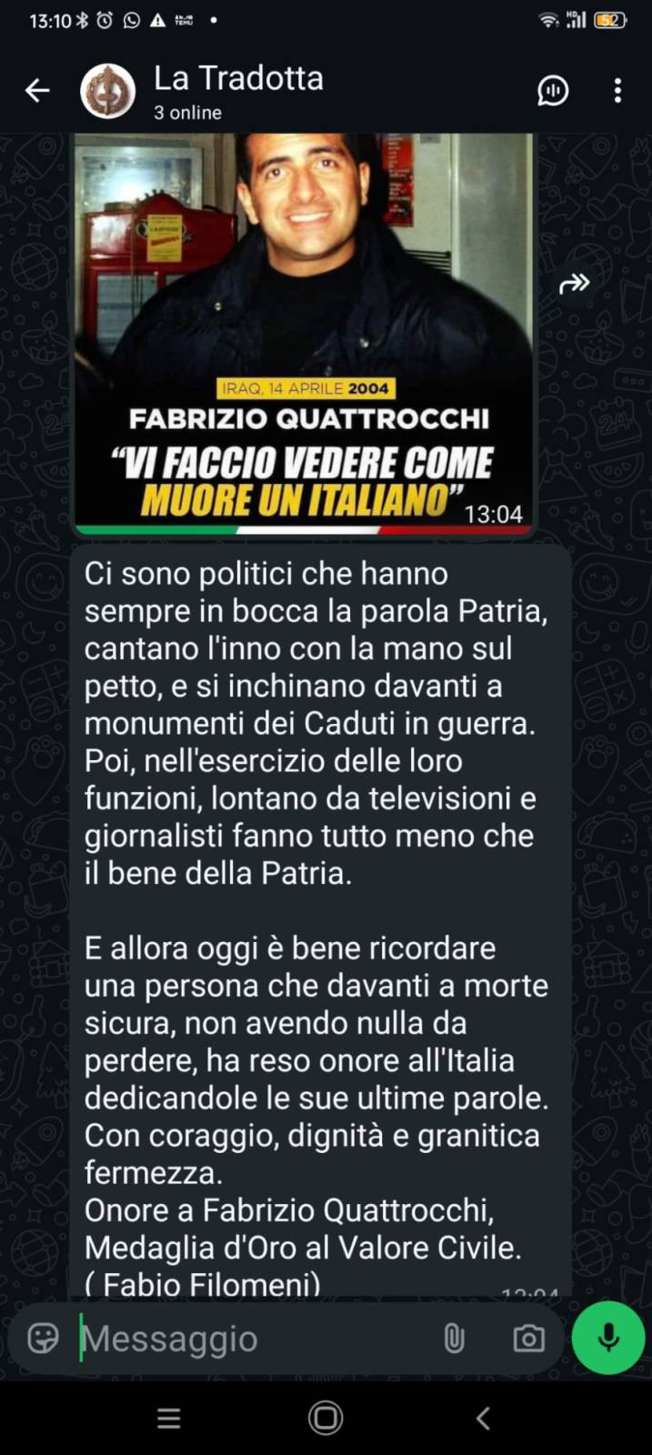 C'era anche lui, uno di noi, uno di quelli cresciuti con la Gazzetta e che non sopporta giornalisti e intellettuali invertebrati. Giuliano Nelli, paracadutista, questa mattina era al cimitero di Staglieno per celebrare il 22° anniversario della morte di Fabrizio Quattrocchi, l'italiano massacrato dai terroristi islamici ai quali non ha venduto la proptria dignità tenendo ben alto il viso e dicendo al suo carnefice: "Adesso vi faccio vedere come muore un italiano". Con lui la sorella di Fabrizio, Graziella Quattrocchi, che incontrammo un mese circa dopo la scomparsa del congiunto. Una donna di straordinaria umanità, con cui avremmo voluto scrivere la biografia del fratello, ma che, all'epoca, non se la sentì essendo troppo fresca la tragedia. 22 anni dalla morte di uno degli eroi più fulgidi del nostro Paese, indimenticato e indimenticabile per noi, dimenticato, invece, da quei vermi verniciati di rosso per i quali l'eroismo è solo quello dik aggredire poliziotti e carabinieri nelle strade. Per noi Fabrizio Quatrocchi resterà sempre un esempio.