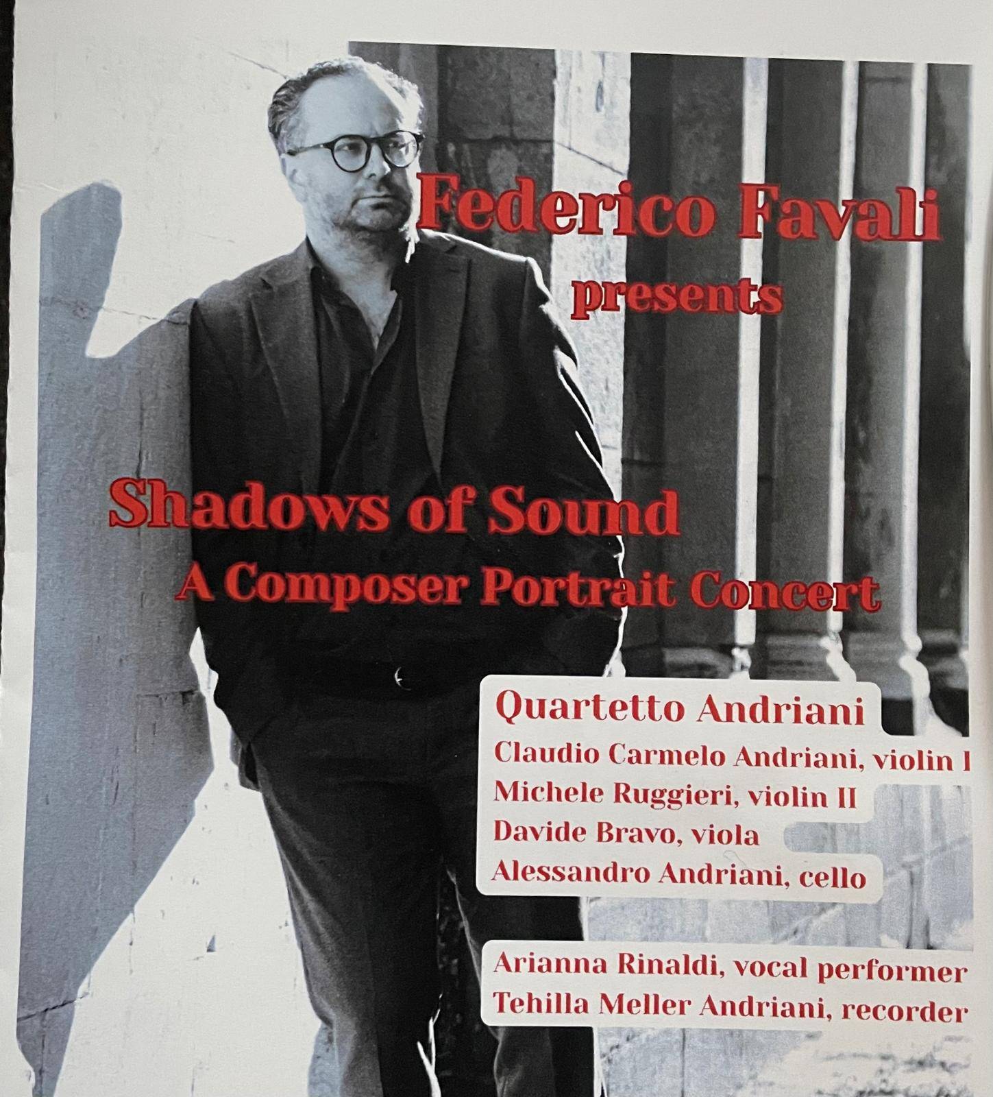 "Shadows of Sound – A composer portrait concert", è stato il titolo del concerto. A suonare le musiche sono stati Claudio Carmelo Andriani, primo violino, Michele Ruggieri, secondo violino, Davide Bravo, viola, Alessandro Andriani, violoncello, Arianna Rinaldi, cantante, Tehilla Meller Andriani, flauto dolce.
