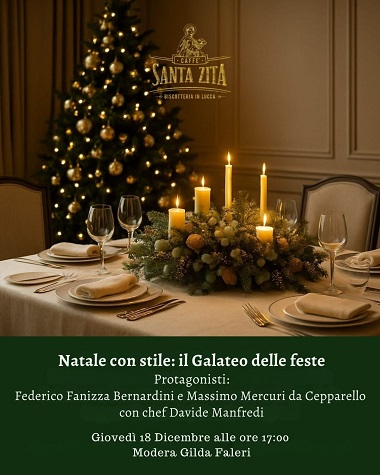 Lo scorso 21 novembre nei suggestivi locali del Caffè Santa Zita, alla presenza del sindaco di Lucca Mario Pardini, si è svolto un evento dedicato al bon ton ed al buon vivere, con protagonisti Massimo Mercuri da Cepparello e Federico Fanizza Bernardini, intervistati dalla Royal Watch e dalla giornalista Gilda Faleri. Dato il successo riscosso e l’interesse suscitato che ha coinvolto anche la Rai, svariate testate cartacee ed on line e Noi TV, l’evento verrà replicato il 18 dicembre prossimo, sempre nello storico ed apprezzato locale di piazza San Frediano a Lucca. Il nuovo appuntamento, con gli stessi protagonisti, sarà dedicato alle buone maniere da usare nel periodo delle festività natalizie ed al modo di apparecchiare una tavola con stile, eleganza e correttezza, seguendo le regole del galateo. Durante la serata verranno quindi affrontati i temi dell’accoglienza e del bon ton a tavola nelle occasioni festive, dall’impostazione del tovagliato alla disposizione delle posate e dei bicchieri, dai segnaposto ai decori del centrotavola e tutti gli argomenti verranno sviscerati, senza dimenticare suggerimenti utili rivolti sia a chi organizza cene familiari sia a chi riceve amici ed ospiti in occasione delle feste di fine anno. É previsto anche un momento conviviale, pensato per chiudere l’evento all’insegna del gusto, della tradizione e del territorio. A conclusione della serata infatti, verrà offerto ai presenti l’assaggio di un dolce tipico lucchese, preparato da Matteo Alberto Mazzoni, maestro pasticcere del Caffè Santa Zita. Ecco di seguito i dettagli dell’appuntamento: il 18 dicembre alle ore 17 al Caffè Santa Zita si parlerà de “Le buone maniere durante le festività e come si apparecchia una tavola seguendo il galateo”. A conclusione dell’appuntamento a tutti i presenti sarà offerto l’assaggio di un dolce tipico lucchese preparato dal maestro pasticcere del Caffè Santa Zita Matteo Alberto Mazzoni.