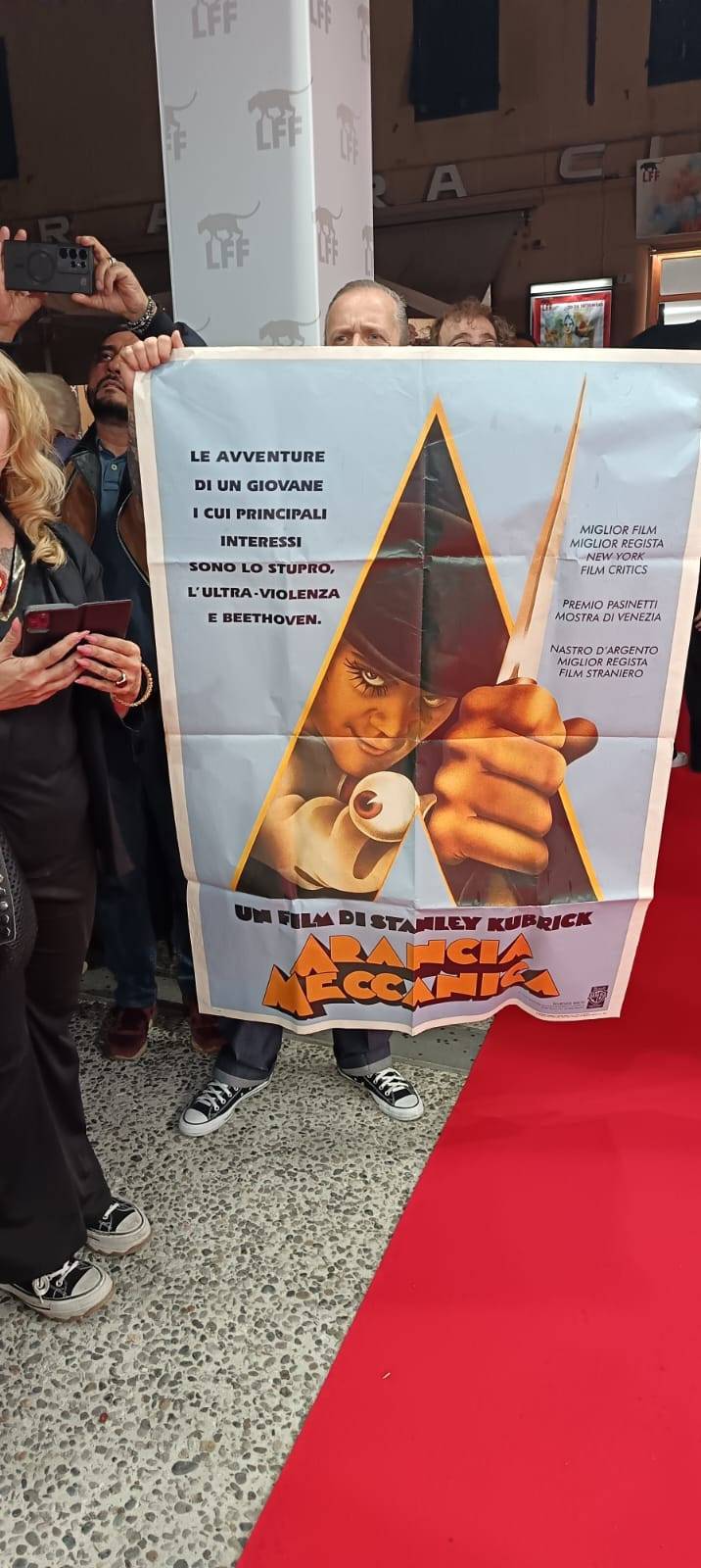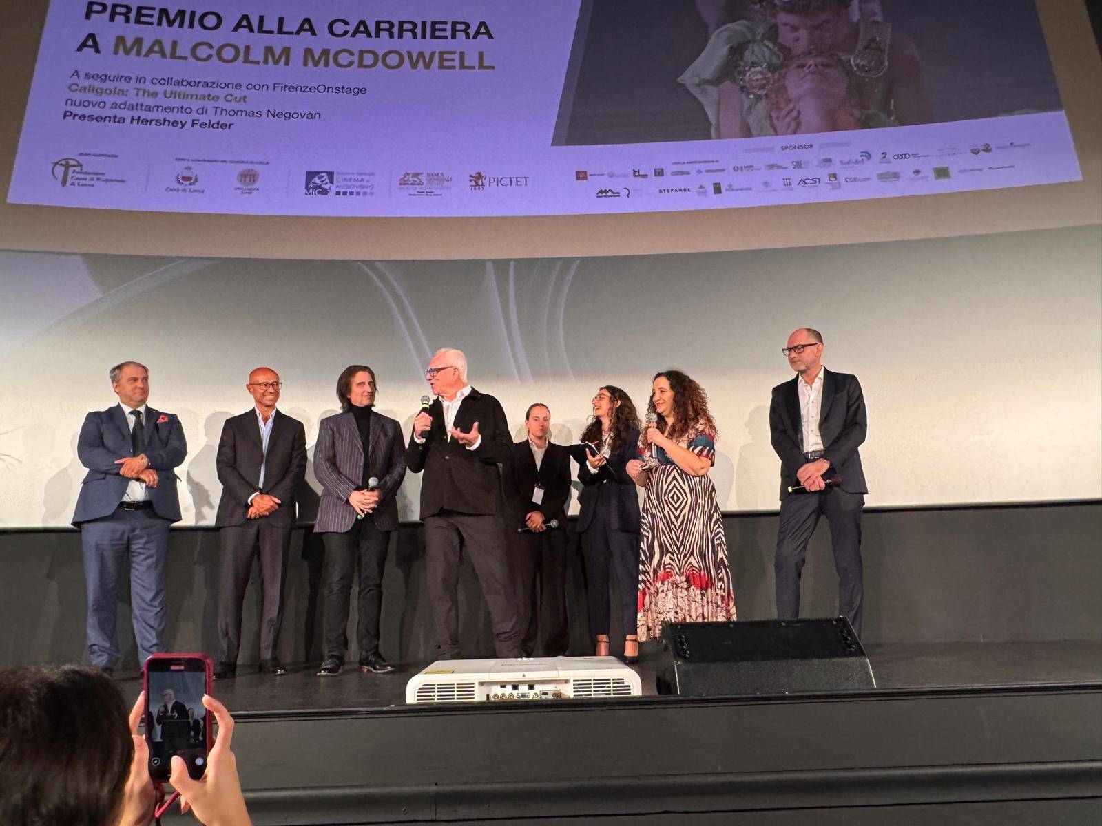Malcolm McDowell, indimenticabile interprete di Alex DeLarge, considerato uno dei personaggi più celebri ed iconici, per non dire cattivissimi, della storia del cinema, ha ricevuto il Premio alla Carriera nel corso della quinta giornata della XXI^ edizione del Lucca Film Festival, mercoledì 24 settembre al Cinema Astra. Il copione delle serate si ripete con ordine flemmatico al Festival del Cinema di Lucca, e con il lustro degli artisti che si eleva esponenzialmente di giorno in giorno. Ne è chiara riprova la presenza di sempre maggior pubblico ed in fervente attesa sul red carpet per salutare, in questa occasione, il grande attore britannico, per poi prendere posto in sala per assistere alla sua premiazione ed alla visione del film “Caligola: The Ultimate Cut”, del regista italiano Tinto Brass, ma in versione ricostruita da Thomas Negovan e tratto dalla sceneggiatura di Gore Vidal. “Lucca è una città bellissima e sono molto contento di essere qui questa sera – ha esordito l’attore britannico. Sono felice di ricevere un premio alla carriera anche se questo significa che il tempo passa. Ho avuto una bellissima carriera da artista e, per me, è stato un enorme privilegio iniziare questo percorso in giovane età, potendo addirittura interpretare anche alcuni personaggi di Shakespeare. Malcolm McDowell, che ha una filmografia sconfinata sia come attore cinematografico che televisivo, ha vinto anche premi come il “Nastro d'argento Europeo”, l'”Evening Standard British Film Award” ed il “Lifetime Achievement Award” del Saturn Award, oltre ad altri innumerevoli riconoscimenti, da festival come il “Taormina Film Fest” ed il “Torino Film Festival”. “Il primo film della mia carriera – ha poi raccontato Malcom – si intitolava “If”, che vinse la Palma d’oro al Festival di Cannes nel 1969. Il regista fu Lindsay Anderson che è diventato il mio mentore, una persona ed un professionista incredibile che, ovunque sia adesso, ringrazio e ringrazierò per sempre perché è grazie a lui che ho potuto incontrare altri registri, tra cui Stanley Kubrick. Stanley aveva un proiettore su cui vedeva film in continuazione. Arriva la scena in cui entro in campo passando una sciarpa. Lui mise in pausa e chiese di rivedere quella scena più e più volte. Alla fine si girò verso la moglie dicendogli: “Cara, abbiamo trovato il nostro Alex”. Prima della consegna del Premio alla Carriera a Malcolm McDowell, è stato rivolto un pensiero personale da parte di Stefano Giuntini, presente in rappresentanza del sindaco di Lucca Mario Pardini, per la scomparsa ed in memoria della grande attrice italiana Claudia Cardinale. “Il sindaco, impegnato in una trasferta all’estero – ha aggiunto Giuntini – sarà sicuramente presente per la chiusura di questa rassegna del Lucca Film Festival. A nome del Comune e della città di Lucca, in questa sede, vorremmo ringraziare tutto lo staff del LFF perché sappiamo quanto sia impegnativo e complicato organizzare un evento di questa portata”. Il Lucca Film Festival va avanti e giovedì 25 settembre, per gli amanti del regista David Lynch, al Cinema Centrale alle ore 21, sarà proiettato in anteprima il film “Legend of the Happy Worker”, una commedia umana su un uomo semplice che viene catapultato al potere, che cade in disgrazia e trova la redenzione. Una storia di fede e di lavoro, del bene contro il male, alla ricerca del senso della vita in un mondo imperfetto.