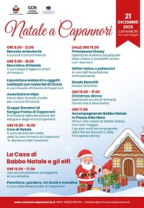 ore 8-20 Mercato ambulante a cura di Confcommercio; ore 9-18 Mercatino di Natale a cura degli Artigiani e Artisti di Pandora; Esposizione elaborati e oggetti realizzati con materiali di riciclo a cura della Scuola dell'Infanzia di Capannori; Stand delle Guardie Zoofile sezione Lucca e Provincia (associazione Oipa), Promozione della donazione del sangue e degli emocomponenti a cura del Gruppo Donatori di Sangue Fratres di Capannori; ore 15-16 'Coro di Natale' a cura degli alunni della scuola primaria 'Amalia Bertolucci Del Fiorentino' di Capannori; dalle ore 15 Principesse Disney, spettacolo di danza sul piazzale della chiesa e possibilità di foto con i bambini, Glitter tattoo e palloncini a cura dell'associazione Animatamente, Banda Bassotti - musica itinerante; ore 16-17 'Christmas dance', spettacolo a cura di Armonia Danza Arte & Movimento; ore 17 Accompagnando Babbo Natale in piazza Aldo Moro. Ritrovo alla casina di Babbo Natale in via Carlo Piaggia. Il gruppo sarà accompagnato dalla Banda Bassotti e dalle Principesse Disney.