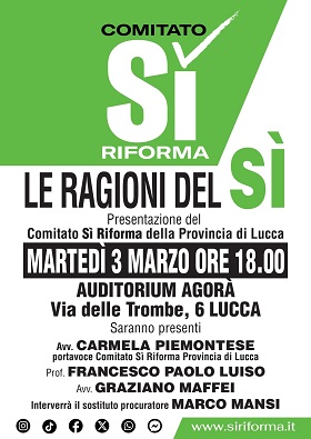 Si terrà martedì 3 marzo alle ore 18, presso l'Auditorium Agorà di Lucca, l'evento "Le ragioni del sì", organizzato dal Comitato "Sì Riforma" della provincia di Lucca.