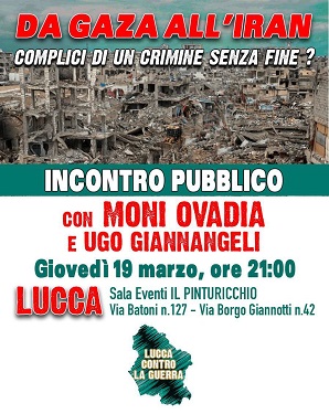Giovedì 19 marzo (ore 21), presso la sala eventi del Pinturicchio di Lucca (accessi da via Batoni 127 e da via Borgo Giannotti 42), interverranno Moni Ovadia ed il giurista Ugo Giannangeli che tratteranno della drammatica ed esplosiva situazione del Medio Oriente.