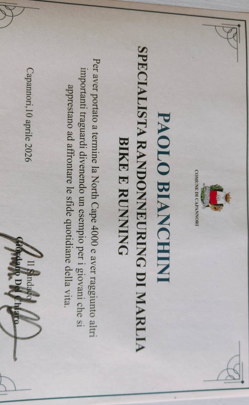 Un importante riconoscimento è stato consegnato allo specialista randonneuring di Marlia Bike Paolo Bianchini. Il 51. enne atleta montemagnese che difende con onore i colori capannoresi da tanti anni vede così premiato il suo amore per la bicicletta, la sua dedizione e la promozione del territorio con imprese straordinarie portate a termine entro i tempi consentiti a livello nazionale e internazionale. Un attestato di benemerito che gli ha consegnato il Sindaco di Capannori Giordano Del Chiaro con la motivazione di aver portato a termine il 3 agosto 2024 anche la North Cape 4000, l' Ultracycling più partecipata al mondo ed averlo fatto in 14 giorni e 2 ore, attraversando 7 paesi dopo la partenza da Rovereto: Italia, Austria, Germania, Danimarca, Svezia, Finlandia, Circolo Polare Artico e Norvegia con arrivo a Capo Nord per una fra le sfide più impegnative per raggiungere la meta finale. Questo è soltanto uno degli appuntamenti di Bianchini delle decine che lo hanno visto pedalare su e giù per l' Italia collezionando brevetti ovunque e completando eventi di resistenza estrema. Il suo legame con Marlia Bike e Running è indissolubile dal 2016 ad ora, cioè dal momento che fu costituita la società presieduta da Amedeo Bandoni, il "Guru" del ciclismo capannorese. Per portare a termine simili imprese Paolo necessita di una specifica preparazione fisica, combinando alti volumi di allenamento, forza e gestione della fatica nel pedalare a lungo e a volte con le condizioni metereologiche avverse , abituando il corpo a sforzi prolungati. Marlia Bike è la prosecuzione della tradizione ciclistica di Capannori, una terra che ha sempre sfornato campioni: da Mario Cipollini, alle squadre Fanini per decenni vittoriose in tutte le categorie compreso quelle professionistiche. Capannori grazie a Fanini è dal 1948 terra di ciclismo, ma anche di passione. Molteplici sono gli eventi ciclistici che hanno attirato sportivi e appassionati, fungendo da grande strumento di promozione locale. Fra queste società ciclistiche hanno sempre dato un forte contributo anche il Gragnano Sporting Club, Bike Academy, Michela Fanini, Cycling Team di Pierluigi Castellani, il Ciclo Team San Ginese e Marlia Bike.